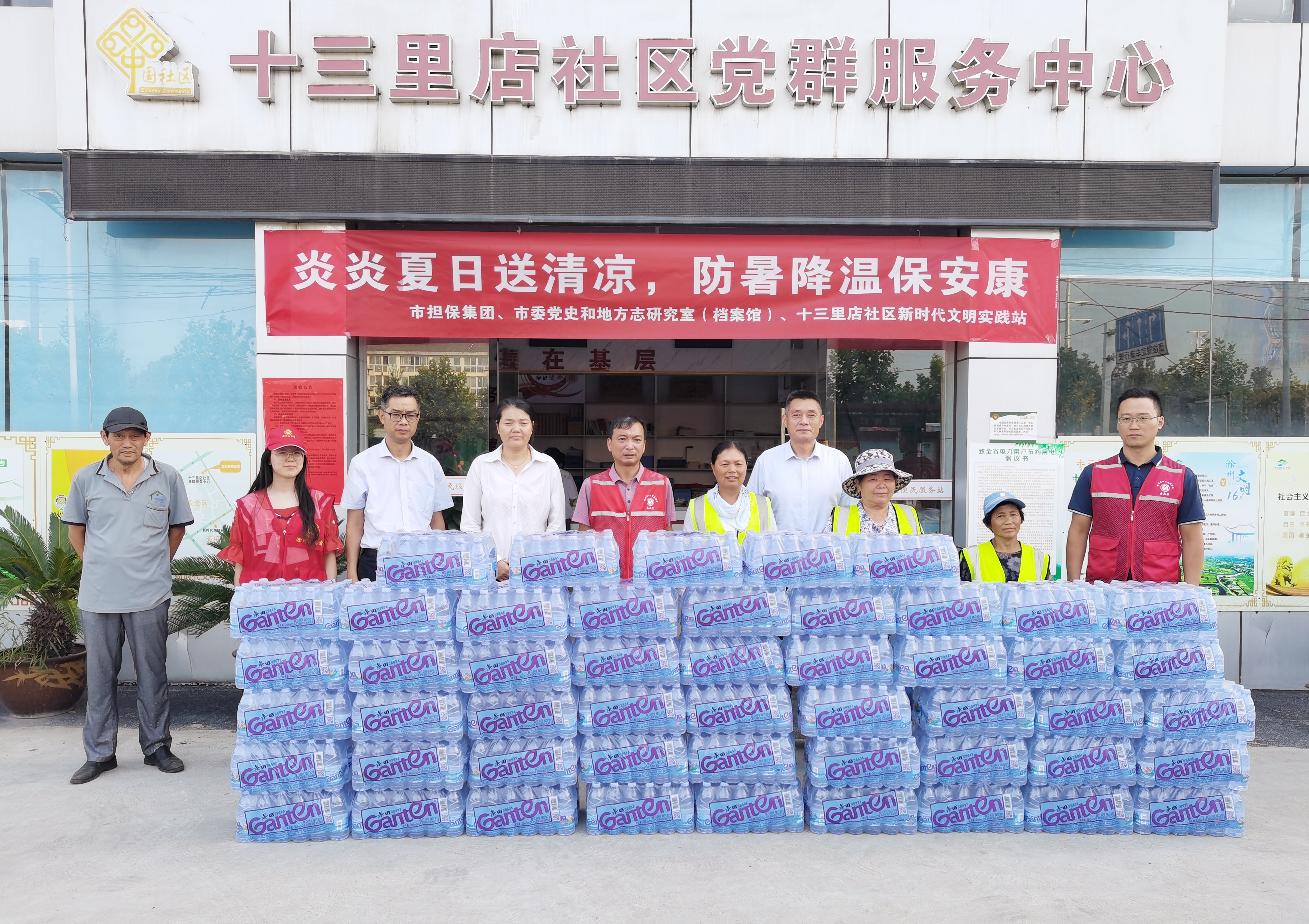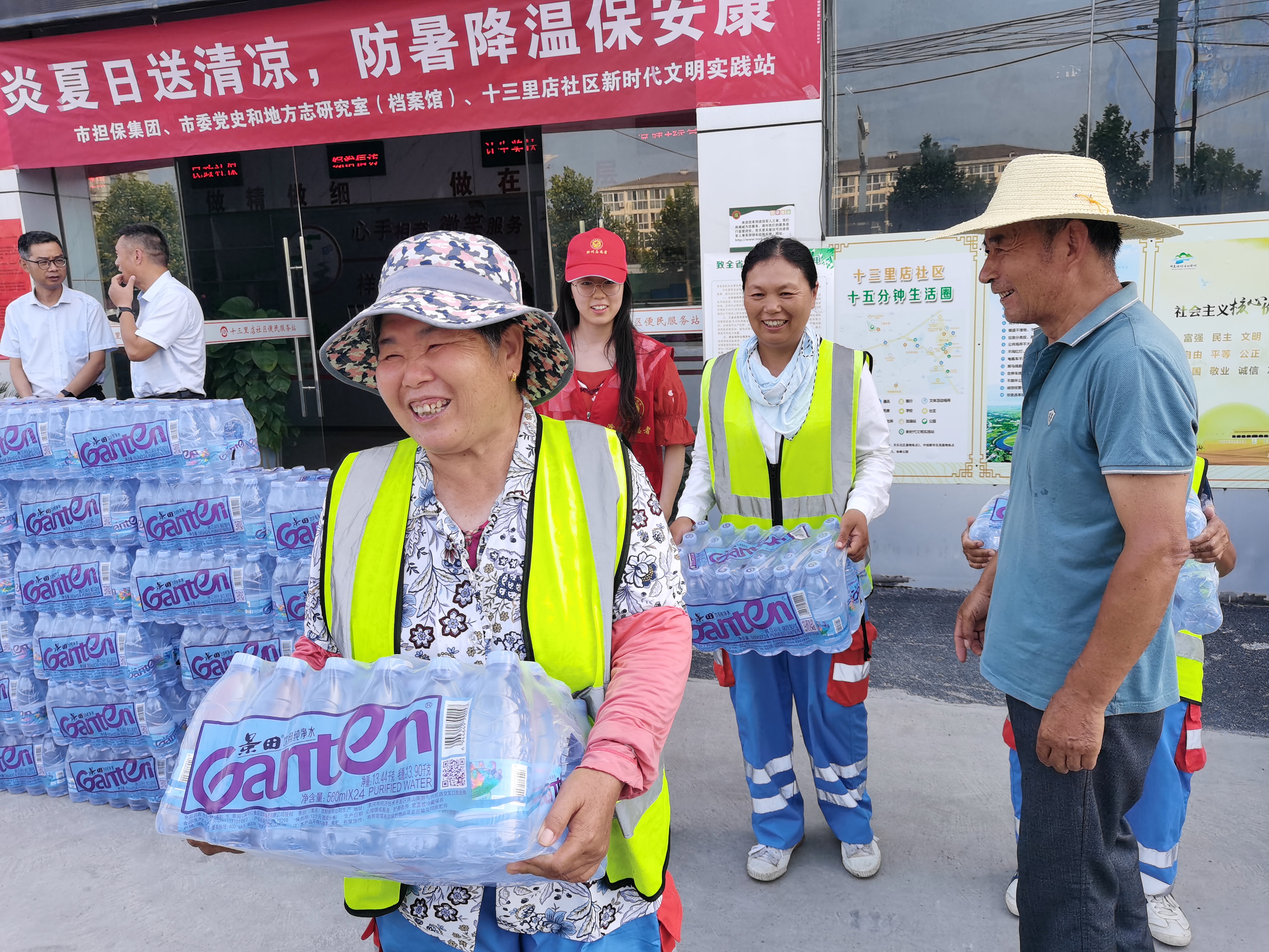 連日來,氣溫一直居高不下,處處熱浪滾滾,戶外作業(yè)的環(huán)衛(wèi)工人們頂烈日、冒酷暑,用辛勤的汗水換來干凈整潔的環(huán)境。為給他們送去一份清涼和關(guān)愛,市擔(dān)保集團(tuán)第一、第二黨支部聯(lián)合市委黨史辦、十三里店社區(qū)黨組織共同開展以“ 炎炎夏日送清涼,防暑降溫保安康”為主題的夏送清涼主題黨日活動(dòng),有效推動(dòng)黨群融合,持續(xù)推進(jìn)“我為群眾辦實(shí)事 ”實(shí)踐活動(dòng)走深走實(shí)。