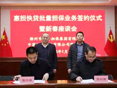 1月18日下午,滁州市融資擔(dān)保集團有限公司與中國銀行滁州分行舉行“惠擔(dān)快貸”批量擔(dān)保業(yè)務(wù)簽約儀式暨新春座談會。市擔(dān)保集團黨委書記、董事長、總經(jīng)理高文進,中國銀行滁州分行黨委書記、行長湯志斌出席簽約儀式,雙方業(yè)務(wù)部門負(fù)責(zé)人以及企業(yè)代表參加。集團黨委委員、副總經(jīng)理張健與市中行黨委委員、副行長徐杰代表雙方簽署合作協(xié)議。