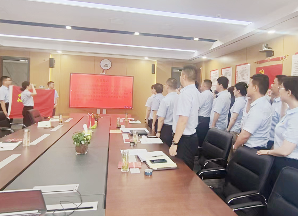 在優(yōu)秀黨員代表領(lǐng)誓下,全體黨員面對鮮紅的黨旗和莊嚴的誓詞,共同高舉右拳,莊嚴宣誓。鏗鏘有力的宣誓聲響徹會場,錚錚誓言提醒著黨員們永葆入黨初心,踐行使命擔(dān)當。