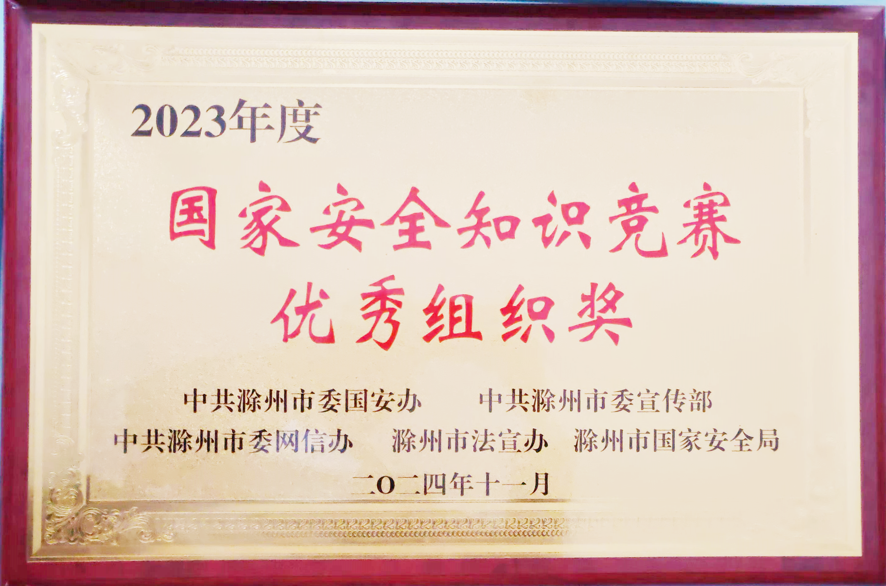 近日,市擔(dān)保集團(tuán)榮獲滁州市2023年度“國(guó)家安全知識(shí)競(jìng)賽優(yōu)秀組織獎(jiǎng)”,該競(jìng)賽由市委國(guó)安辦、市委宣傳部、市委網(wǎng)信辦、市法宣辦、市國(guó)家安全局聯(lián)合組織開(kāi)展,集團(tuán)已連續(xù)兩年獲此榮譽(yù)。