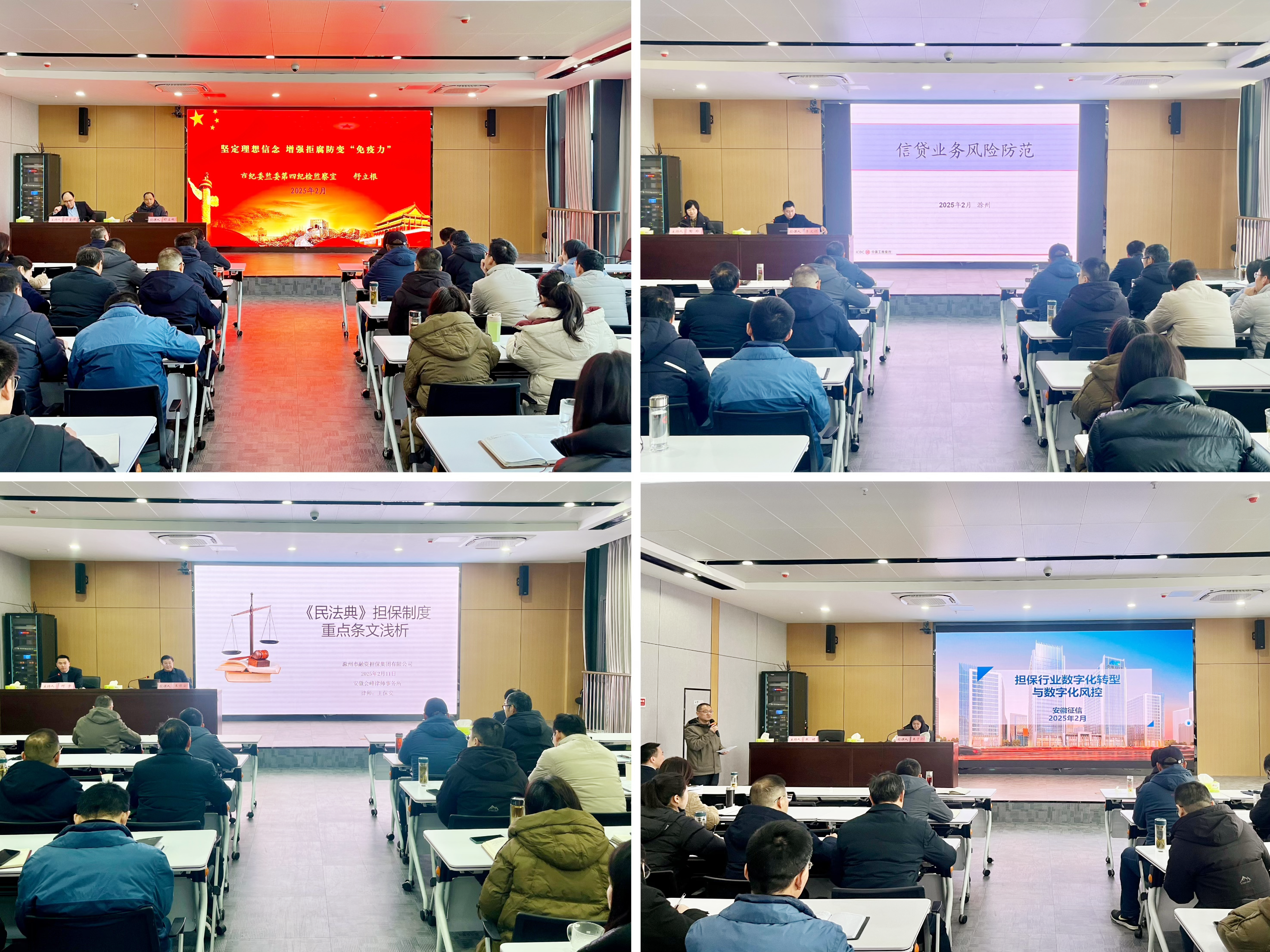 夯實風控基礎,筑牢合規(guī)防線。特邀工商銀行滁州分行信貸專家李文順作《信貸業(yè)務風險防范》專題培訓,系統(tǒng)解析了銀行業(yè)信貸風險演變規(guī)律及防控體系,為擔保業(yè)務全流程風險防控要點及舉措提供了優(yōu)化建議,切實提升了全員對預見、預防、總結(jié)業(yè)務風險的能力水平。會峰律師事務所王保安律師以《民法典擔保制度重點條文淺析》為題,重點對“物權(quán)法”中涉及擔保抵押業(yè)務的法條進行了細致解讀,并深入擔保業(yè)務場景以案釋法,幫助全體職工研判形勢變化,識別防范新法律風險。